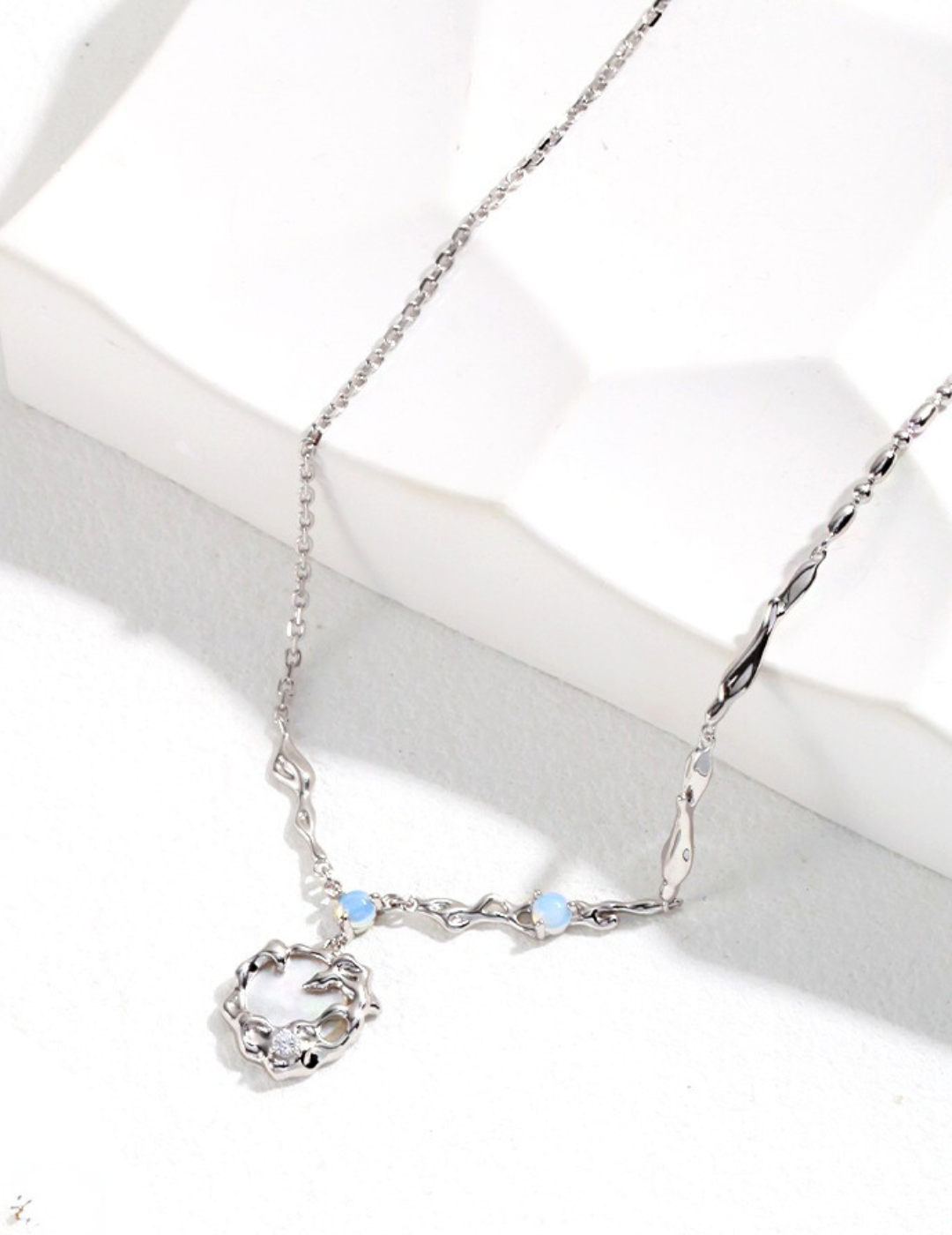 Introducing the Moonlit Opal Pearl Necklace, a piece inspired by the enchanting realm of the moon palace. This necklace is a part of an exclusive series where the radiant mother of pearl symbolizes the moon itself. Surrounding this luminous centerpiece is a butterfly silhouette, its design influenced by the intricate patterns of the laurel tree butterfly. Adding to its allure, the necklace features iridescent opal stones, capturing the mesmerizing colors of a butterfly's wings. Crafted from high-quality S925 silver, complemented by opal and mother of pearl, this necklace is the epitome of elegance with a touch of individuality, this necklace promises to be a timeless addition to your collection.