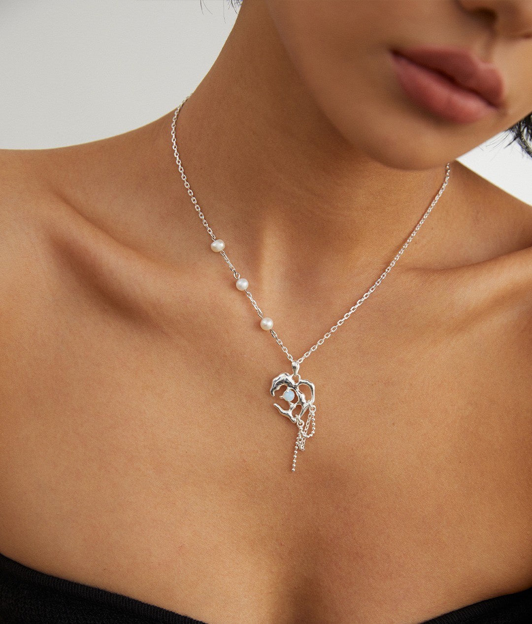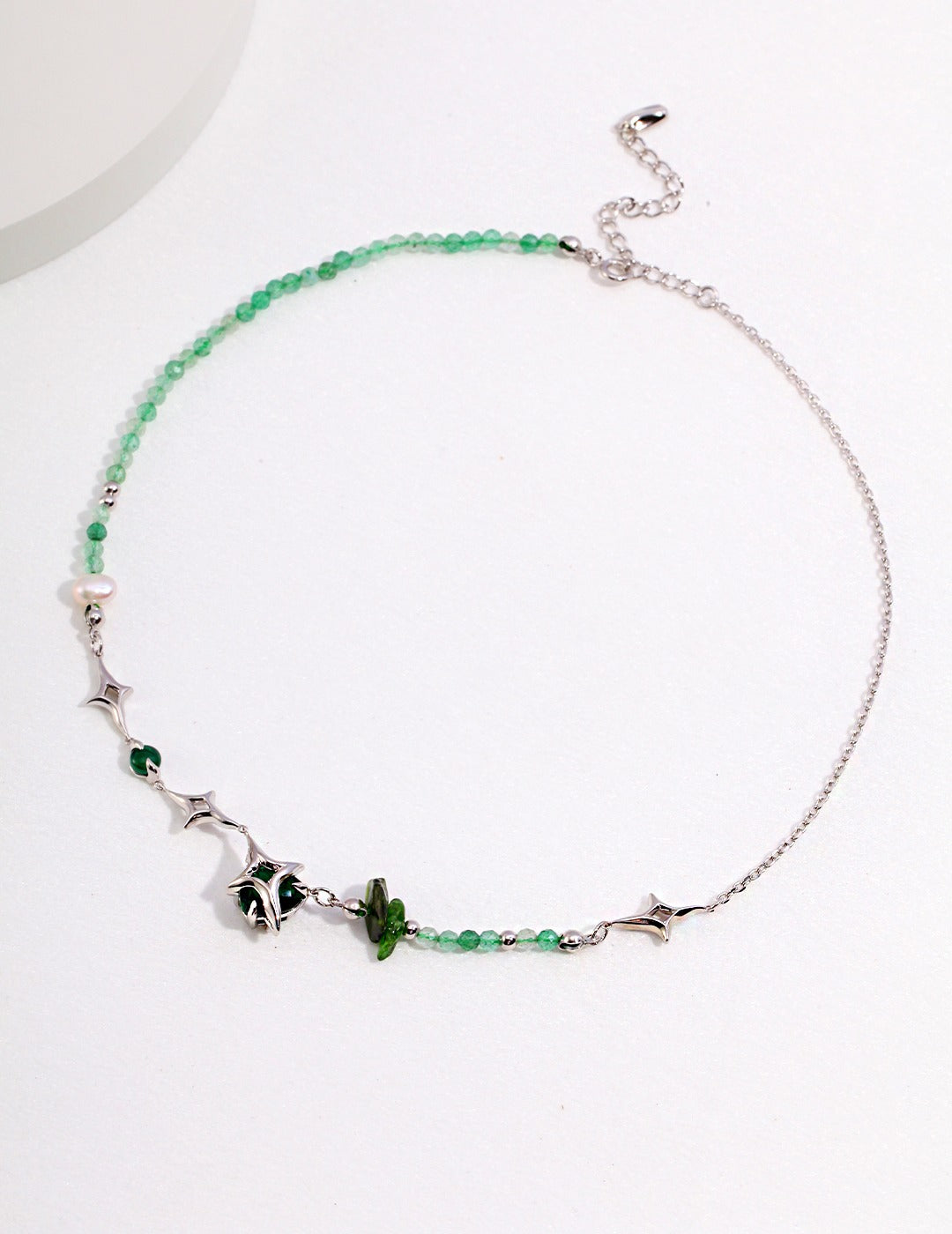The Twisted Heart Sterling Necklace is a unique blend of modern design and timeless elegance. Made from S925 silver, the necklace is adorned with natural pearls, green strawberry quartz, and zirconia. At its core, the necklace features a four-pointed heart, sculpted with an abstract twist that gives it a rhythmic charm. On the reverse side, a gemstone heart radiates vibrant life, adding a touch of contemporary flair.